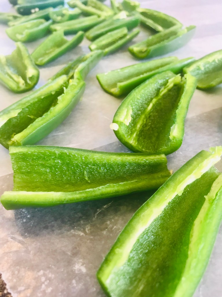 Slice jalapeño peppers length-wise and spoon out the center (including seeds).