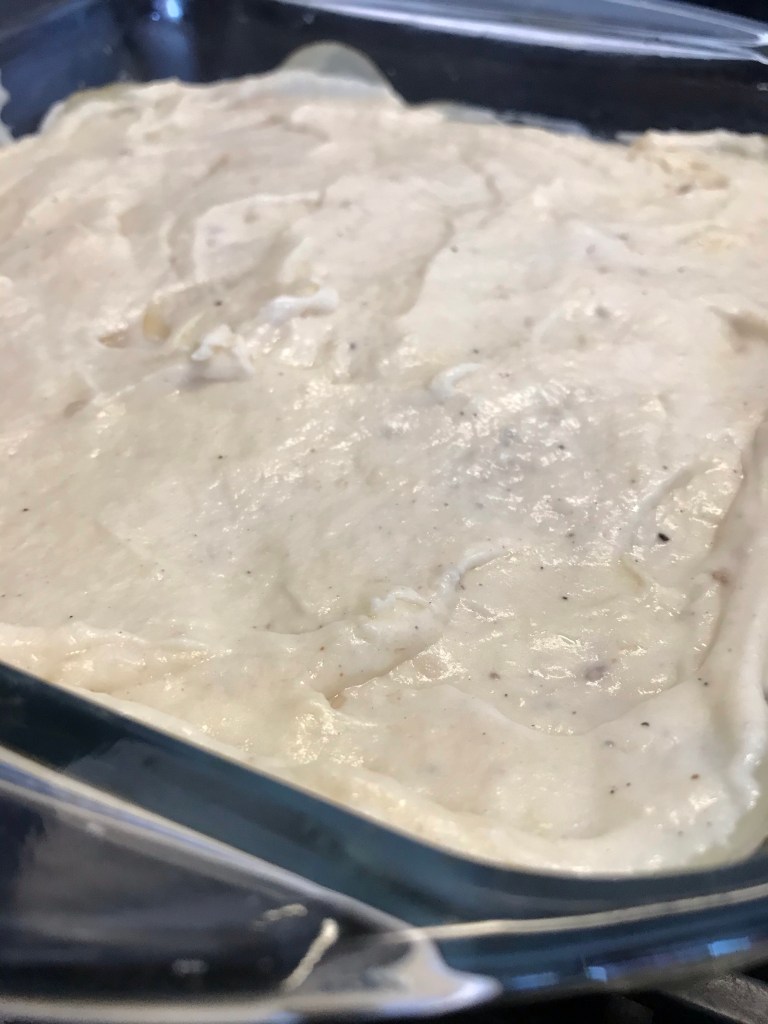 Begin assembling in an 8×8 greased baking dish: Layer of potatoes followed by layer of cream sauce followed by reserved grated cheese.