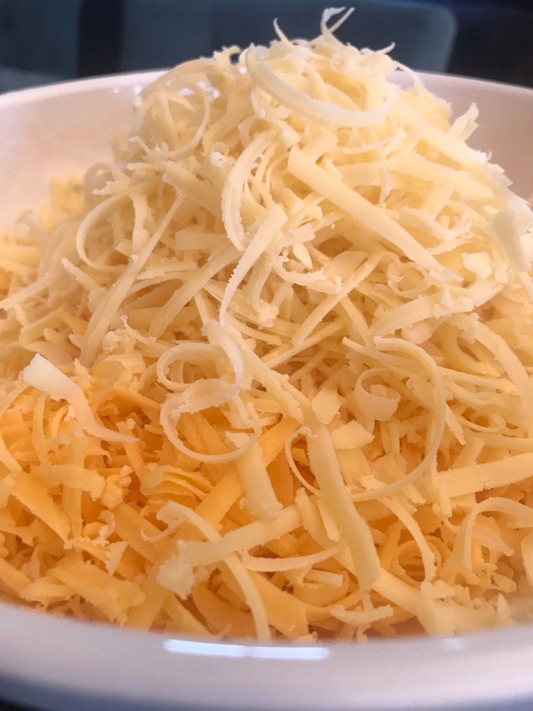 Repeat layering until you have used up all the potatoes, sauce & cheeses. Top layer should be grated cheese.