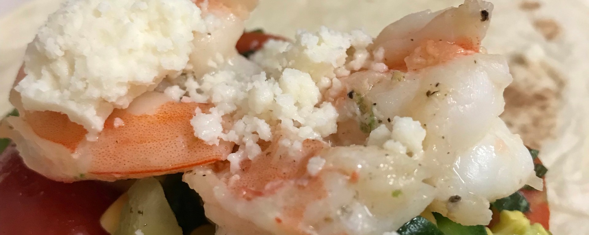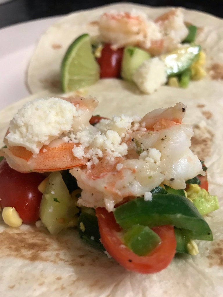 Assemble tacos with shrimp, corn salsa & top with cotija cheese crumbles