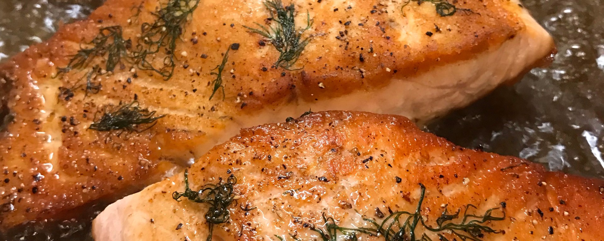 While filets are searing on the other side (4 minutes) use a sharp knife to finely slice off the skins. Season with more lemon zest, salt, pepper & dill.