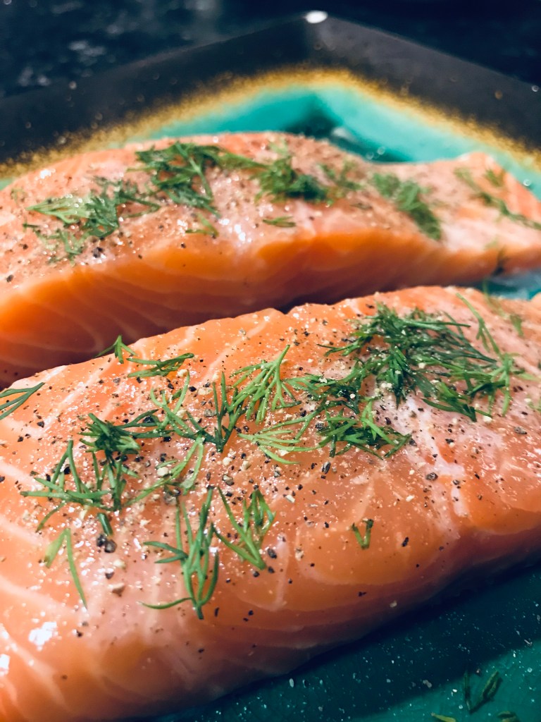 Chop the fresh dill sprigs & rub onto salmon.