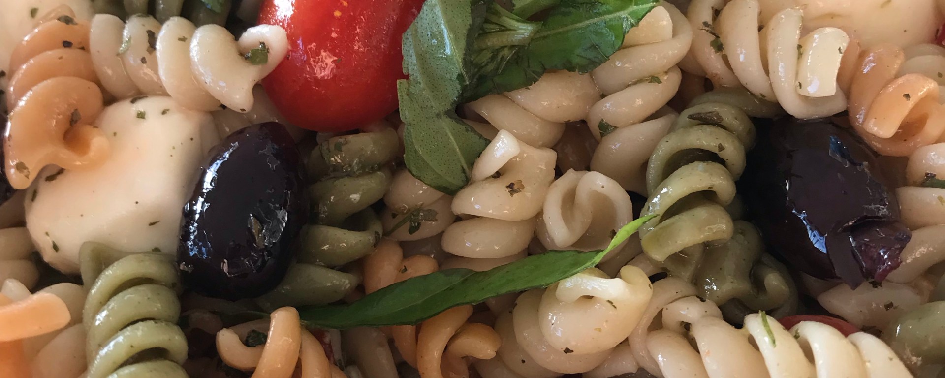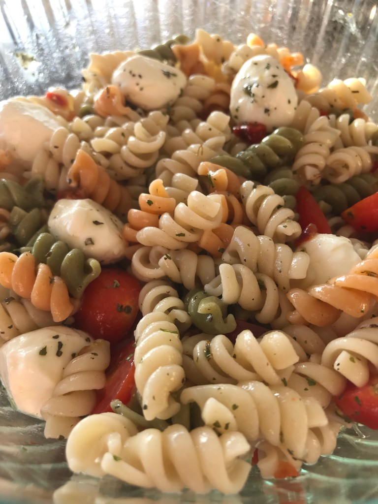 Once pasta has cooled, add tomatoes, olives & mozzarella pearls to pasta. Try adding a diced English cucumber for extra crunch.