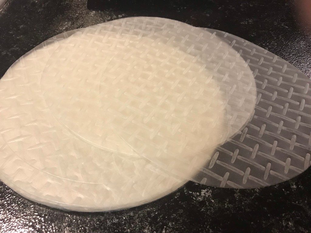 Take a rice wrap and dip it into the water quickly. The wrap should just barely go into the water for a second, otherwise it will become gummy and you won’t be able to work with it. Note: The quick-dipped wrap will continue to soften as you work with it.