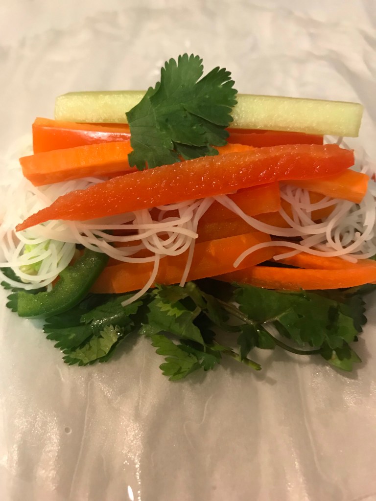 On a clean surface (I like to use a large baking sheet lined with wax paper) begin assembling your spring rolls.